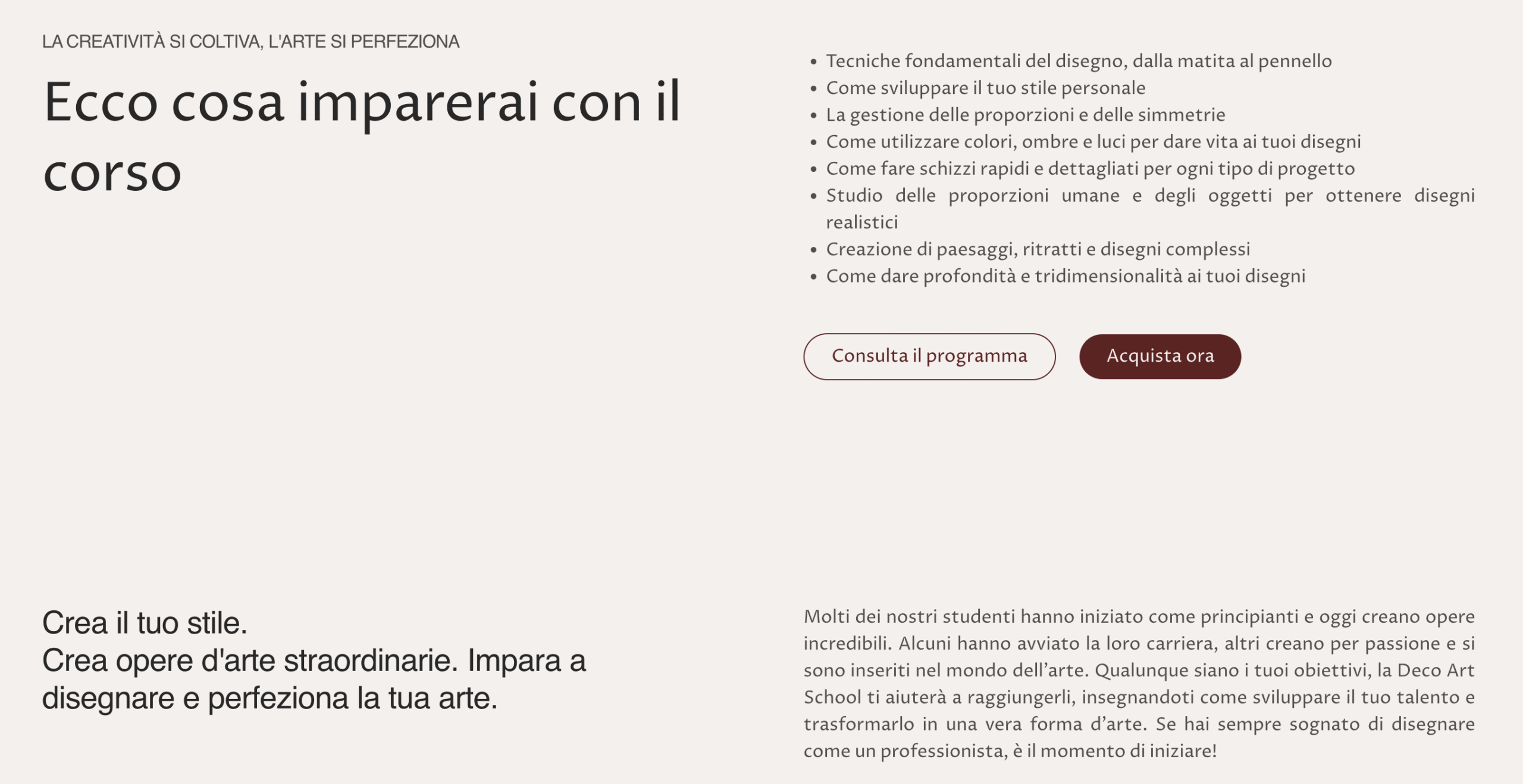 Deco Art & Deco Art School è un progetto che unisce creatività, formazione e visione artistica in un’offerta pensata per chi vuole apprendere, crescere e sviluppare il proprio talento. Per valorizzarlo al meglio, abbiamo lavorato su identità, comunicazione e presenza digitale, con l’obiettivo di costruire un racconto chiaro, coinvolgente e coerente, capace di trasmettere qualità, autorevolezza e ispirazione.